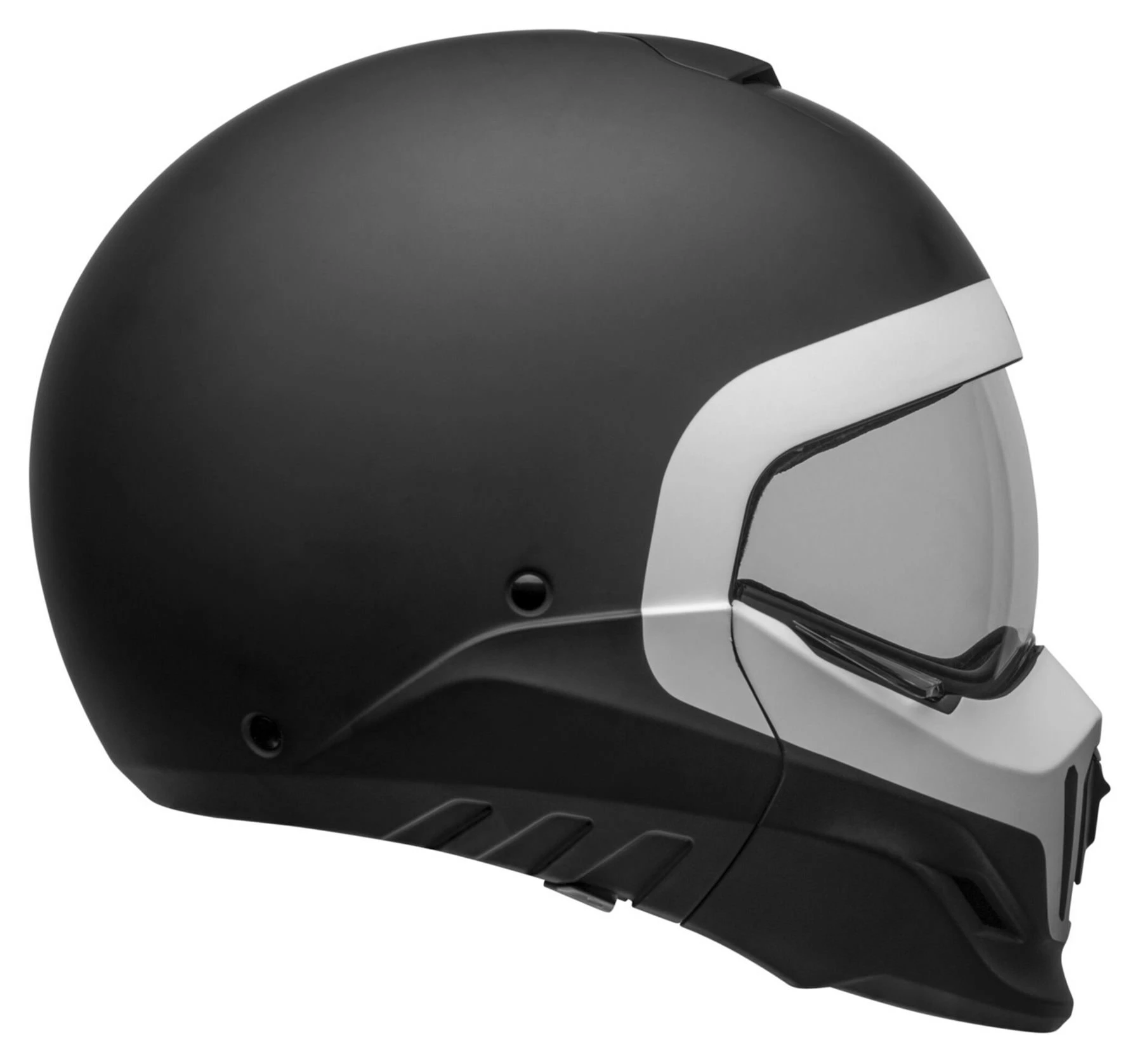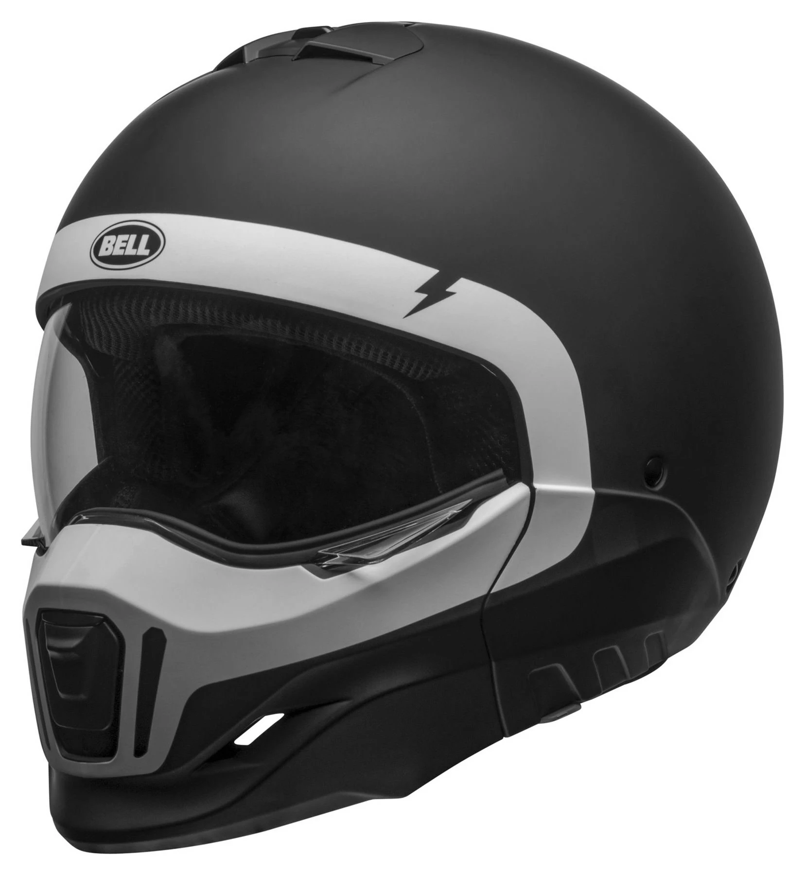 Neo-retro is a very popular trend in the motorcycle world. That goes for the motorbikes themselves, but also biker gear and especially helmets. Bell has taken this trend on board and brought out the *Broozer*, a modular (flip-up) helmet that goes perfectly with modern café racers and even the naked bike scene. With clean lines, large eye port and removable chin piece. Plus great comfort and convenience, a good weight, and strong, aggressive design.