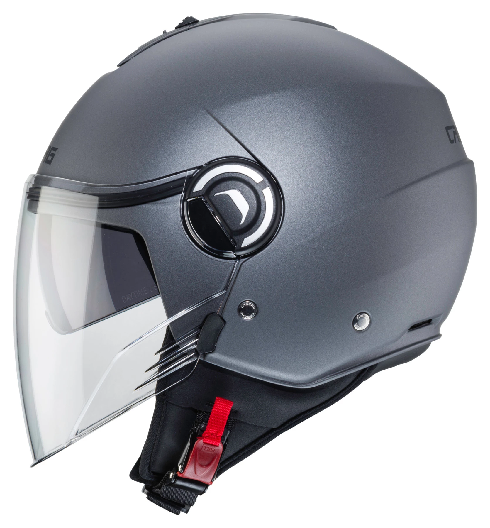 The jet helmet *Riviera V4* from Caberg is the successor of the *Riviera V3*. It impresses with modern designs and with innovative, elegant looks. Compared to the previous model, Caberg has given the helmet a longer visor and a longer sun visor, so you can experience better light and visibility protection and more comfort.