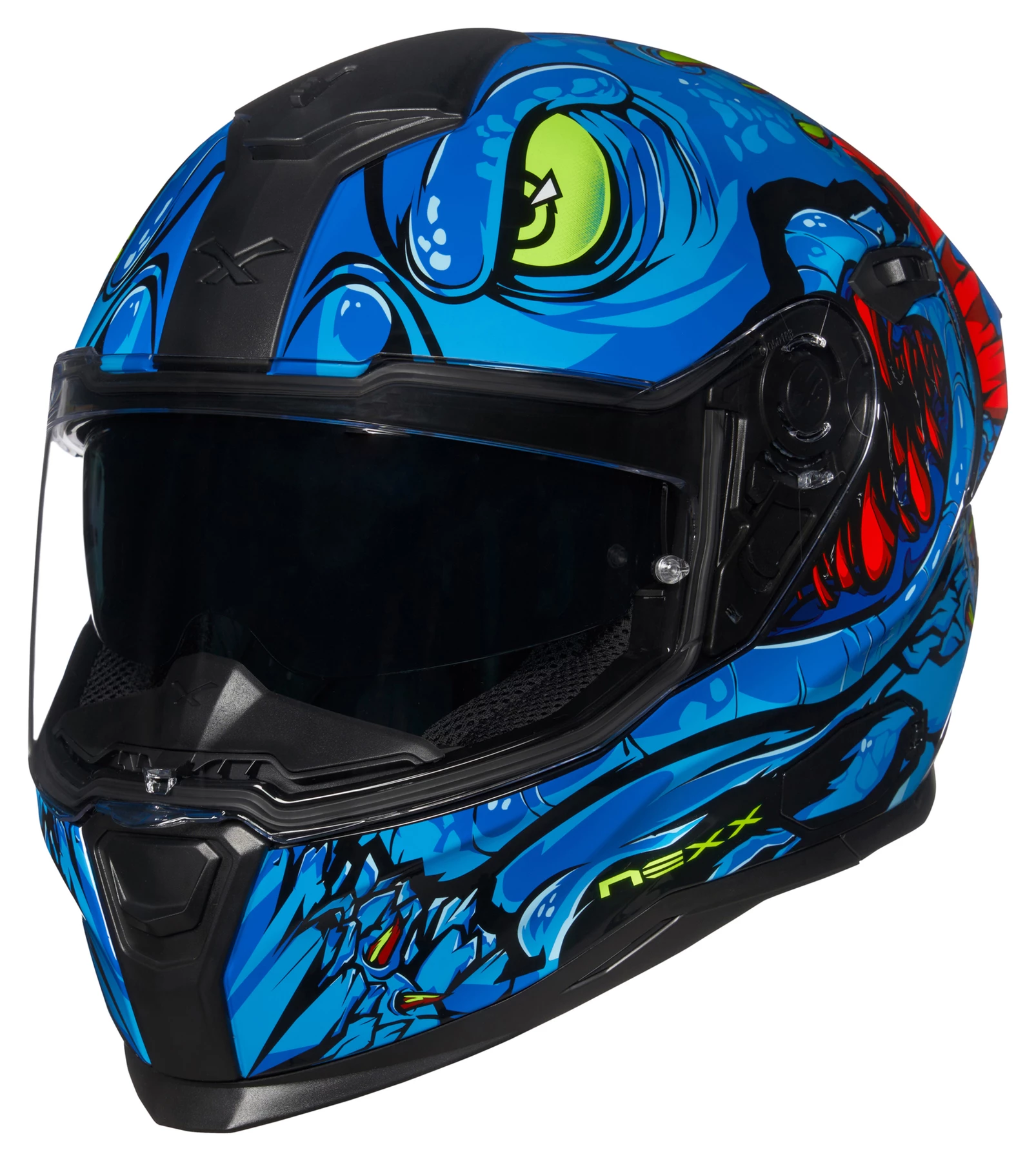 This is it, the NEXX *SX.100R*. A full-face helmet designed for the best aerodynamics. It shows itmself in its distinctive shape and his equipment with a very efficient rear spoiler. This helmet clearly shows its top performance when it comes to reducing turbulence at high speeds. The NEXX *SX.100R* offers you sporty comfort with the innovative inner lining made of ergonomic and breathable panels that allow more fresh air around the head.