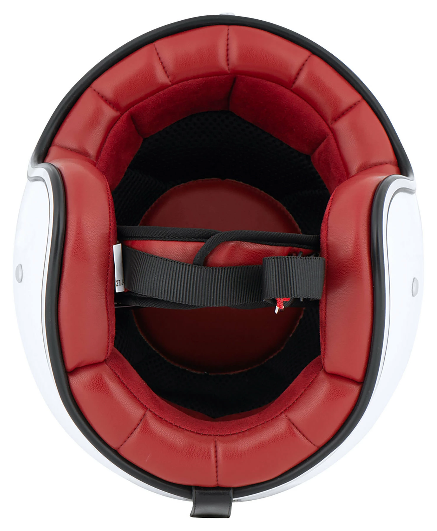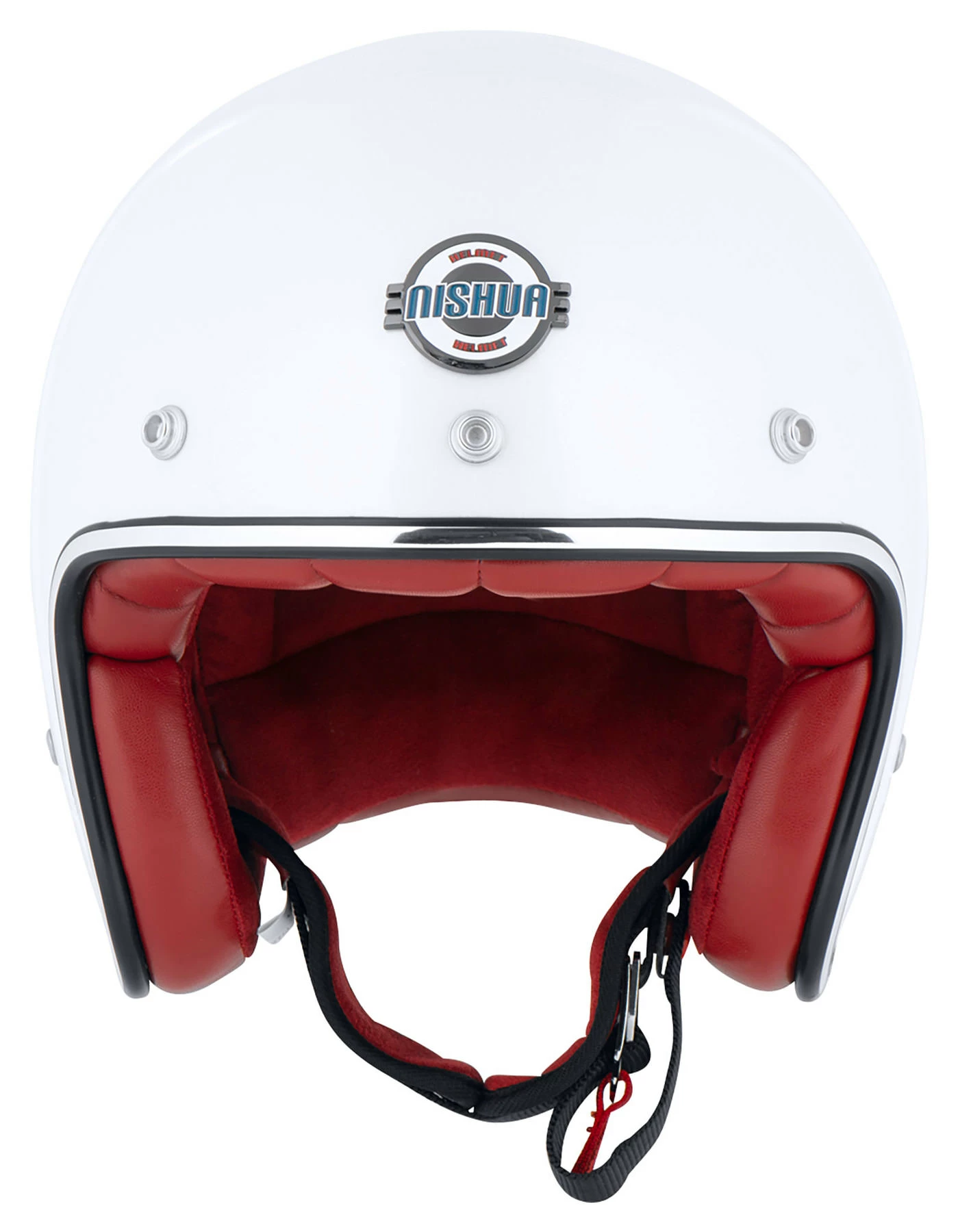 The Nishua *Jet-2* is totally retro – perfect for all jet (open-face) helmet fans. An attractively clean, round, no-frills shape, with chrome trim and smooth leatherette-edged padding – all this lends the *Jet-2* its unique vintage character. The icing on the cake is the Classic Nishua face shield on the forehead. If you forget about the classic look for a moment, what you have is a modern, safe jet helmet that’s ideal for wearing on your scrambler, chopper or naked bike.